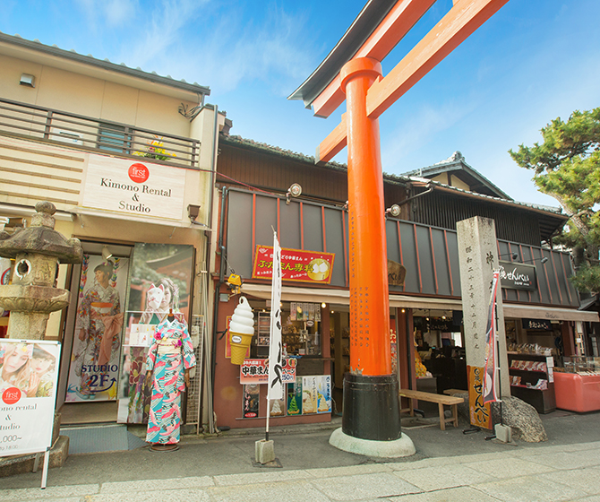 京都屈指の観光スポット伏見稲荷大社から徒歩1分の場所にあり着付け後はすぐに散策して頂けます。千本鳥居をバックに着物姿で撮影すればインスタ映え間違いなし。狐のお面もレンタルございます。JRや京阪も徒歩すぐなので市街地へのアクセスも抜群です。返却は、祇園本店や清水店もご利用頂けます。